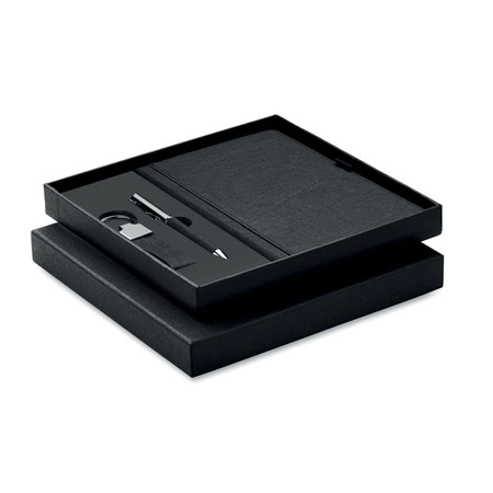 - 3-częściowy zestaw upominkowy w pudełku. Zawiera metalowy przekręcany długopis z detalami z poliestru RPET, notes w twardej okładce RPET z przednią kieszenią na smartfon oraz brelok z poliestru RPET. Niebieski tusz.