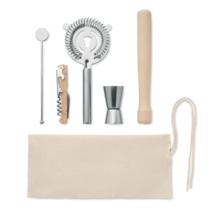- Zestaw koktajlowy w bawełnianym etui ze sznurkiem. Zawiera 5 elementów: dwustronną miarkę (15 i 30 ml), drewniany muddler, sitko do koktajli, mieszadełko do drinków i korkociąg kelnerski.