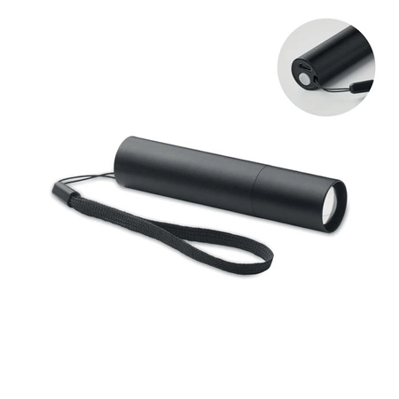 Aluminiowa latarka akumulatorowa o mocy 110 lumenów z 3 ustawieniami światła i funkcją przybliżania/oddalania. Wbudowany akumulator 400 mAh i kabel do ładowania w zestawie.