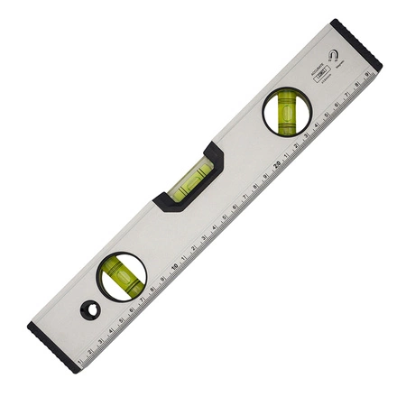 - Aluminiowa poziomica o długości 30 cm wyposażona w magnetyczną podstawę oraz 3 libelle pomiarowe: 0˚, 90˚ i 45˚.