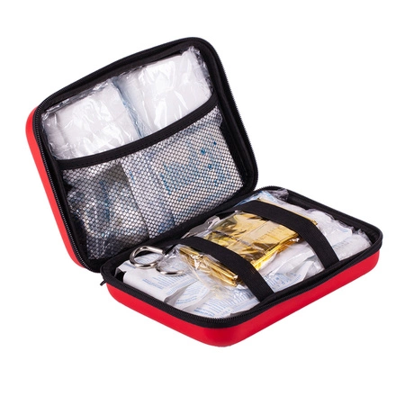 Konieczne wyposażenie każdego samochodu. Zestaw pierwszej pomocy składający się 40 elementów. Zgodny z normą DIN13164. W skład zestawu wchodzą: taśma medyczna 5 m x 2,5 cm, plaster 10 x 6 cm 4 szt , opatrunek na opuszki palców 2 szt, opatrunek na palec 12 x 2 cm 2 szt, plaster z opatrunkiem 1,9 x 7,2 cm 2 szt, plaster z opatrunkiem 2,5 x 7,2 cm 4 szt, opatrunek indywidualny 6 x 8 cm, opatrunek indywidualny 8 x 10 cm 2 szt, opatrunek indywidualny 10 x 12 cm, chusta opatrunkowa 40 x 60 cm, chusta opatrunkowa 60 x 80 cm, rękawice jednorazowe (4 szt), kompres 6 cm 2 szt, kompres 8 cm 3 szt, koc ratunkowy 160 x 210 cm, opatrunek na rany 3 szt, chusta trójkątna 2 szt, nożyczki, chusteczki nasączono 2 szt, instrukcja. Zgodny z normą DIN13164. Produkt zgodny z Dyrektywą 93/42/EEC.
