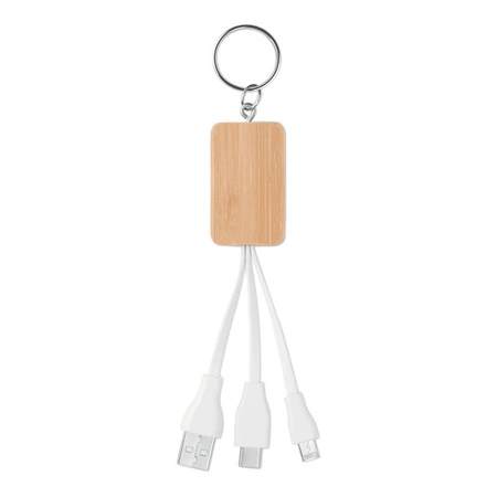 Brelok bambusowy z kablami do ładowania z USB-A na Micro-B (2 w 1) i typ C. Bambus jest produktem naturalnym, dlatego mogą wystąpić nieznaczne różnice w kolorze, wzorze i rozmiarze.