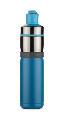 Sportowy bidon z próżnią utrzymuje temperaturę napoju, idealny na wycieczki rowerowe i treningi na świeżym powietrzu. Wygodne zamknięcie na pasku. Stal nierdzewna, wysoki standard.