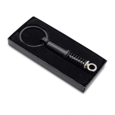 - Brelok w kształcie amortyzatora. Wykonany z metalu w kolorze czarnym z widoczną, sprężynową konstrukcją. Pakowany w czarne opakowanie upominkowe.