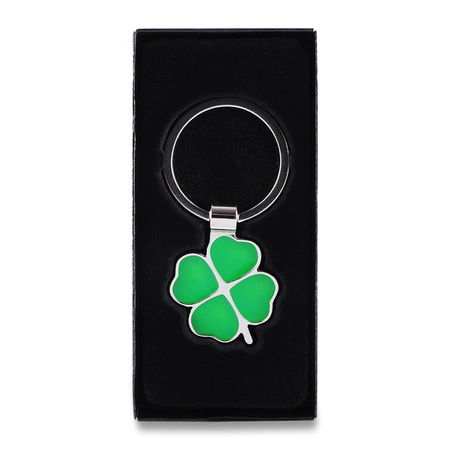 - Metalowy brelok w kształcie koniczynki. Pakowany w czarne opakowanie upominkowe.