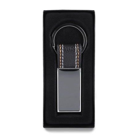 Wykonany z metalu i ekoskóry ze stębnowaniem szykowny brelok. Pakowany w czarne opakowanie upominkowe.