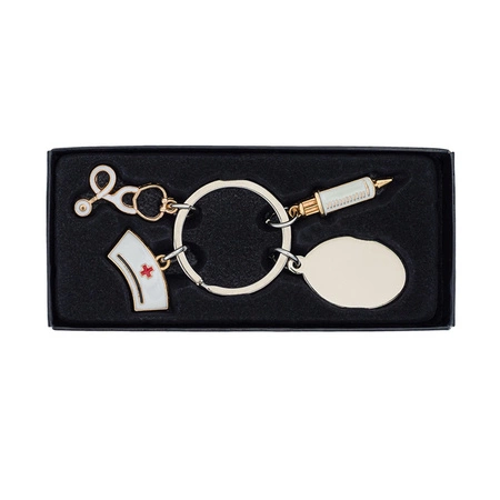 - Metalowy brelok z medycznymi motywami. Zawiera 4 zawieszki: czepek pielęgniarski, stetoskop i strzykawka oraz zawieszka idealna pod grawer. Pakowany w czarne opakowanie upominkowe.