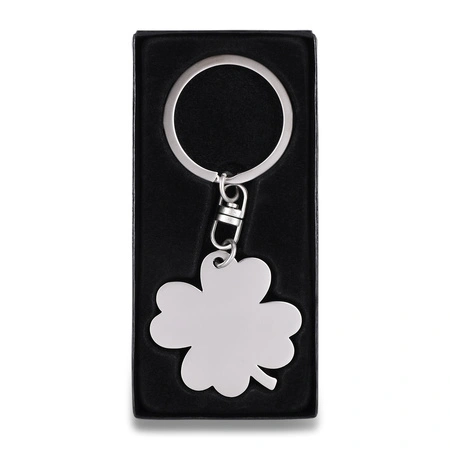 - Metalowy brelok w kształcie czterolistnej koniczynki. Popularny symbol szczęścia. Pakowany w czarne opakowanie upominkowe.