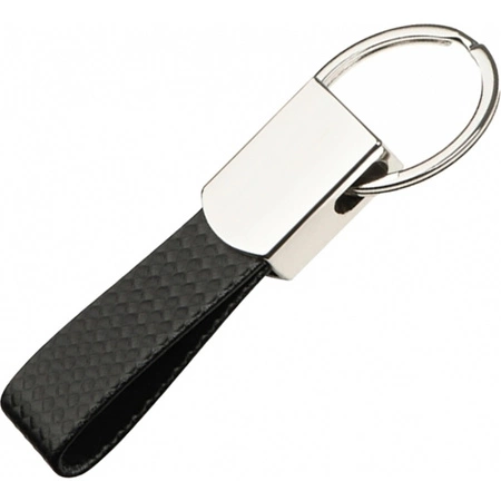 Brelok metalowy z ozdobnym czarnym paskiem, wykonanym z PU.