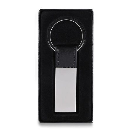 - Brelok będący eleganckim połączeniem metalu i ekoskóry. Pakowany w czarne kartonowe opakowanie upominkowe.