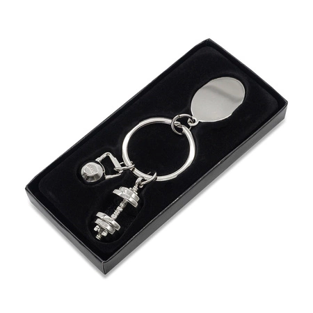 Metalowy brelok zawiera 2 zawieszki: kettler i hantle oraz zawieszkę idealną pod grawer. Pakowany w czarne pudełko upominkowe.