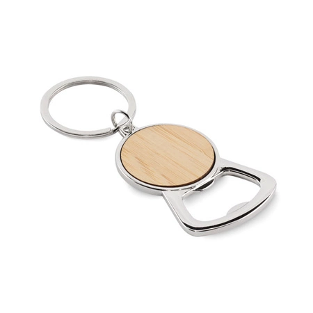 - Metalowy brelok z otwieraczem do butelek i bambusowymi detalami.