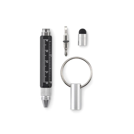 - Brelok do kluczy z przekręcanym długopisem z aluminium pochodzącego z recyklingu z linijką 4 cm i 1,5 cala, rysikiem i śrubokrętem 2 w 1 z łbem krzyżakowym i płaskim. Czarny tusz.