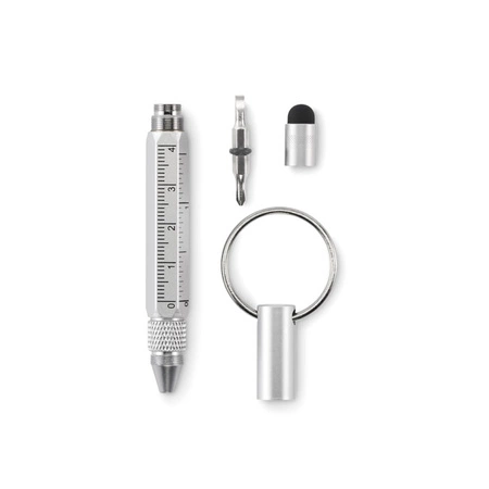 - Brelok do kluczy z przekręcanym długopisem z aluminium pochodzącego z recyklingu z linijką 4 cm i 1,5 cala, rysikiem i śrubokrętem 2 w 1 z łbem krzyżakowym i płaskim. Czarny tusz.