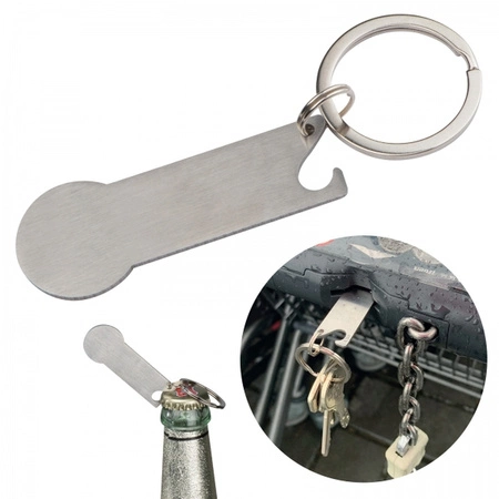 - Metalowy brelok do kluczy z żetonem do wózka sklepowego i otwieraczem.