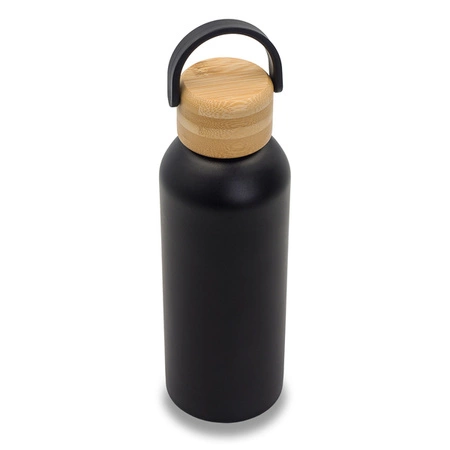 - Szczelna butelka próżniowa wykonana ze stali nierdzewnej. Próżnia pomiędzy dwiema ściankami zapewnia bardzo dobre właściwości termoizolacyjne. Wewnętrzna ścianka wykonana ze stali 18/8. Zakrętka wykonana z drewna bambusowego, wyposażona w uchwyt. Butelka