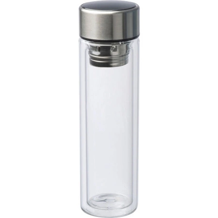 - Butelka termiczna wykonana ze szkła borokrzemowego. Butelka z wyświetlaczem temperatury w pokrywie, sitkiem i pojemnością napełniania 400 ml.