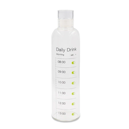 - Butelka ze szkła borokrzemowego z motywacyjnym nadrukiem, zamykana szczelnym, szklanym korkiem. Pojemność: 550 ml.