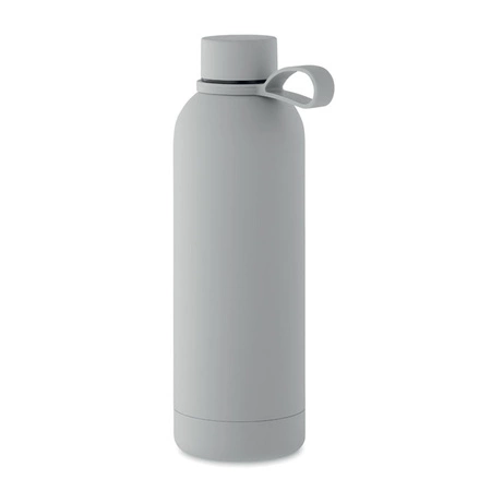- Dwuścienna butelka z izolacją próżniową z recyklingowanej stali nierdzewnej (90% z recyklingowanej stali nierdzewnej i 10% ze stali nierdzewnej) z gumowym wykończeniem i silikonowym uchwytem. Pojemność: 500 ml.
