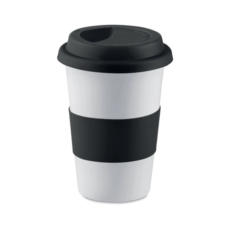 - Pojedynczy ceramiczny kubek z silikonową nakładką i panelem do chwytania. Pojemność 400ml. Transfer ceramiczny jest odporny na zmywanie w zmywarkach. Jako że jest to jednowarstwowy kubek, nagrzewa się też zewnętrzna strona.