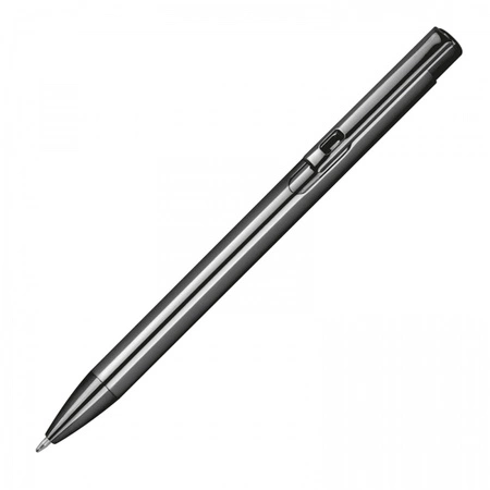 Długopis wykonany z aluminium o metalicznym połysku. Posiada wkład piszący na niebiesko.