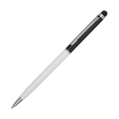 - Długopis z końcówką przystosowaną do ekranów dotykowych. Korpus wykonany z aluminium, skuwka z metalu. Wkład w kolorze niebieskim. Posiada obrotowy mechanizm włączania.