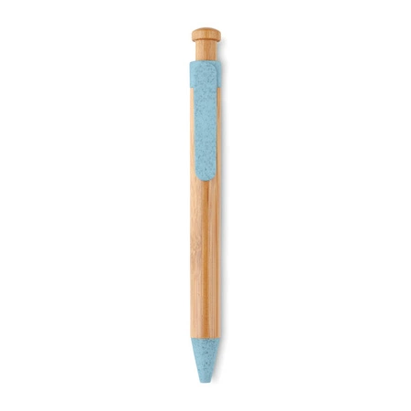 Przyciskany długopis z bambusa i słomy pszenicznej 50% oraz ABS 50% detali. Niebieski wkład. Bambus jest produktem naturalnym, dlatego mogą wystąpić nieznaczne różnice w kolorze, wzorze i rozmiarze.
