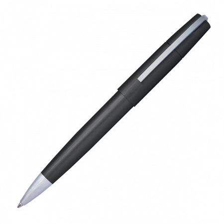 - Przekręcany, metalowy długopis, marki Ferraghini, ze srebrnymi akcentami i dużym wkładem piszącym na czarno.