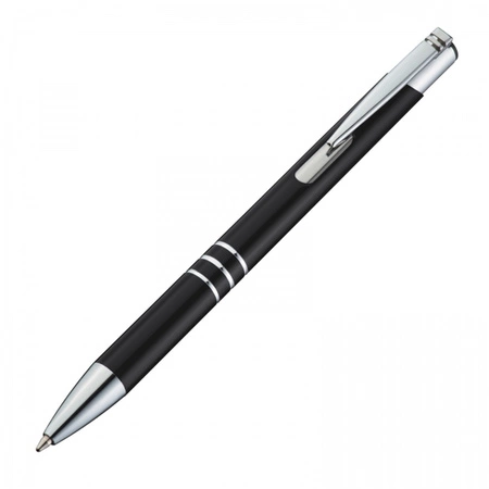 - Klasyczny długopis metalowy z chromowanymi elementami i smukłym klipsem. Długopis wyposażony w duży niebieski wkład.