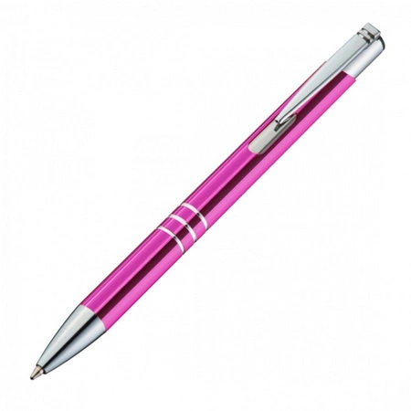 - Klasyczny długopis metalowy z chromowanymi elementami i smukłym klipsem. Długopis wyposażony w duży niebieski wkład.