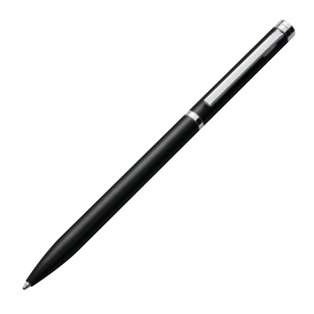- Metalowy długopis z chromowanym klipsem i wkładem piszącym na niebiesko.