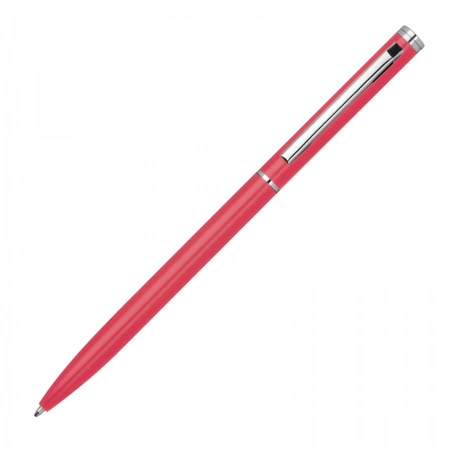 - Metalowy długopis z chromowanym klipsem i wkładem piszącym na niebiesko.