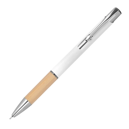 - Piszący na niebiesko, półżelowy długopis wykonany z aluminium pochodzącego z recyklingu ze srebrnymi elementami i bambusową strefą uchwytu.