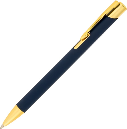 Długopis metalowy soft touch ze złotymi elementami i wkładem piszącym na niebiesko. Nie wykonujemy grawerowania laserowego na długopisach w kolorze białym (06) i czerwonym (05).