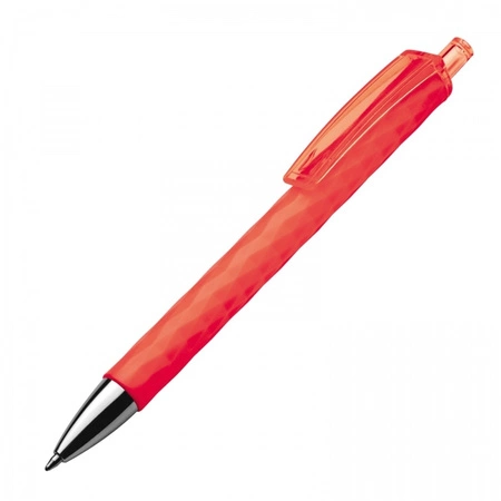- Plastikowy długopis z oryginalnym korpusem i dużym wkładem piszącym na niebiesko.