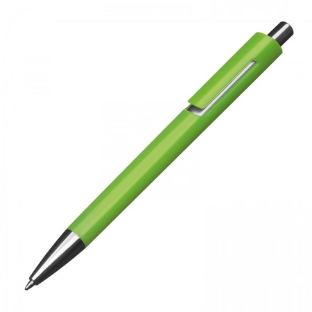 - Plastikowy długopis z wkładem piszącym na niebiesko i srebrną aplikacją pod klipem.