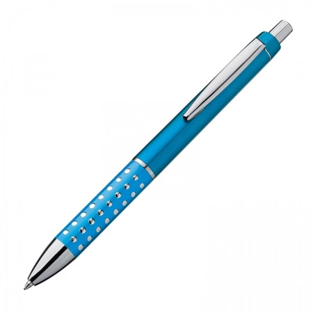 - Plastikowy długopis o ozdobnym korpusie, z wkładem piszącym na niebiesko.