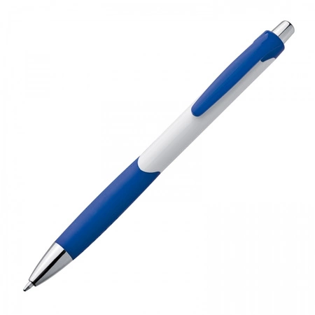 Długopis plastikowy, wyposażony w klips i gumową strefę chwytu oraz niebieski wkład.