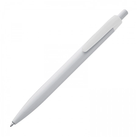 - Plastikowy długopis z białym korpusem o klasycznym kształcie, wyposażony we wkład piszący na niebiesko.