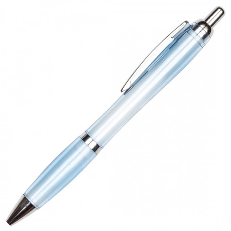 - Klasyczny długopis Alken, którego obudowa została wyprodukowana z 92% tworzywa sztucznego pochodzącego z recyklingu. Wyposażony jest w mechanizm naciskowy typu klik. Przeźroczysty długopis o niebieskim zabrawieniu,a do tego ma ozdobne elementy w srebrym k