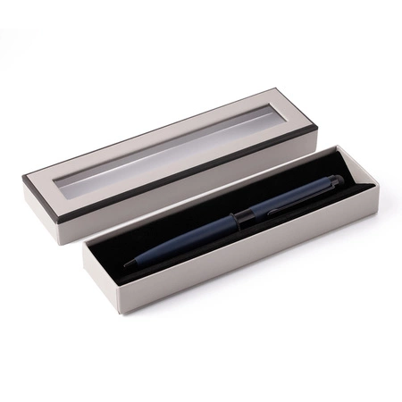 - Metalowy długopis z końcówką przystosowaną do ekranów dotykowych w upominkowym pudełku. Wkład w kolorze niebieskim.