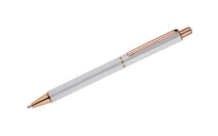 - Elegancki matowy długopis w kolorze różowego złota z metalowym korpusem i klipsem. Idealny dodatek do biurka lub jako prezent.