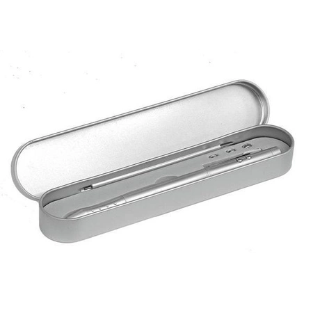 - Metalowy długopis 4 w 1 łączący w sobie cechy długopisu, rysika PDA do ekranów palmtopów lub GPS, wskaźnika laserowego i latarki LED o białym świetle. Wyposażony w niebieski wkład. Dołączone baterie 3 x LR41. Pakowany w srebrne opakowanie upominkowe.