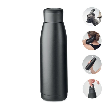 - Dwuścienna butelka (90% z recyklingowanej stali nierdzewnej i 10% ze stali nierdzewnej) z silikonową pokrywką. Wystarczy potrząsnąć, aby temperatura powierzchni zmieniła się na ogrzewanie lub chłodzenie, w zależności od płynu znajdującego się w środku. 40