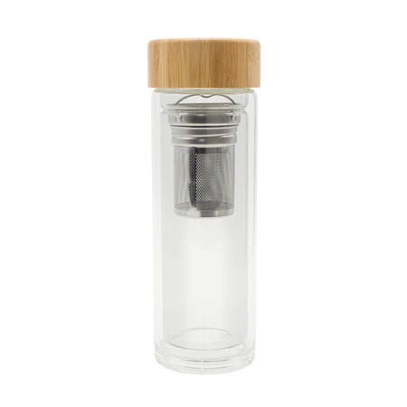 Butelka wykonana z borokrzemowego szkła o podwójnych ściankach, o pojemności 400 ml. Wyposażona w zaparzacz, który umożliwia łatwe przygotowanie ulubionych naparów i herbat. Bambusowa nakrętka nadaje jej naturalny, elegancki wygląd.