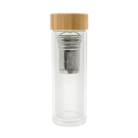 - Butelka wykonana z borokrzemowego szkła o podwójnych ściankach, o pojemności 400 ml. Wyposażona w zaparzacz, który umożliwia łatwe przygotowanie ulubionych naparów i herbat. Bambusowa nakrętka nadaje jej naturalny, elegancki wygląd.