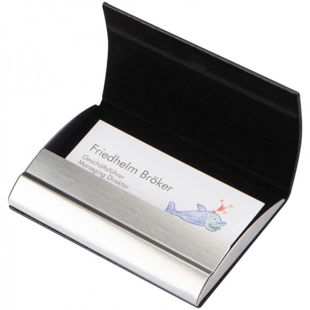 - Etui na wizytówki wykonane ze skóry syntetycznej i metalu, zamykane na magnes.