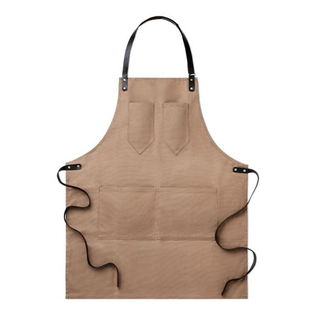- Fartuch z woskowanego płótna z elementami ze skóry. Regulowany pasek, 2 mniejsze kieszenie i 1 większa w dolnej części fartucha.