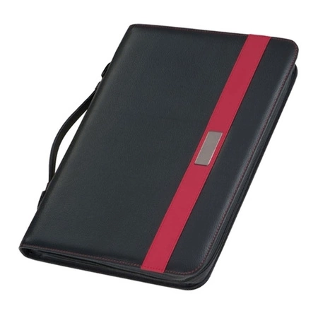 - Folder A4 wykonany papieru, pvc oraz stali. Wyposażony w szlufkę na długopis, mechanizm ringowy, notes (30 kartek), podstawkę pod tablet, kieszonkę na telefon komórkowy, 8 przegródek, duża przegroda, rączkę, zamykany na zamek błyskawiczny. Dostępny w czar