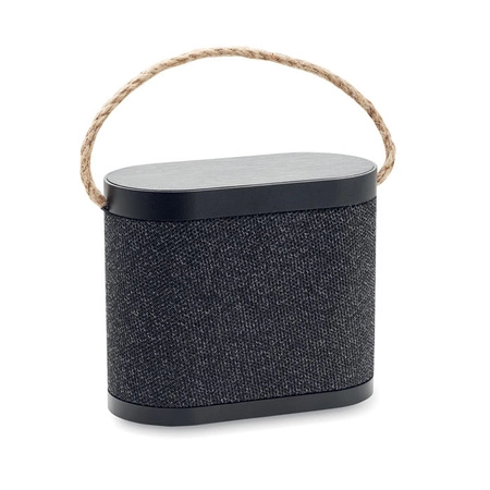 5.3 głośnik bezprzewodowy z ABS z wykończeniem z tkaniny poliestrowej RPET i bambusową ładowarką bezprzewodową 15 W, z uchwytem z juty. 1 akumulator litowo-jonowy 1200 mAh. Dane wyjściowe: 5W, 4 Ohm i 5V. Czas odtwarzania ok. 4 godz.